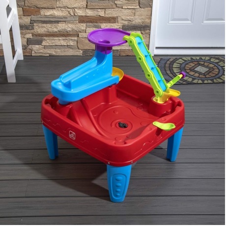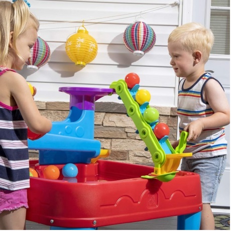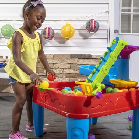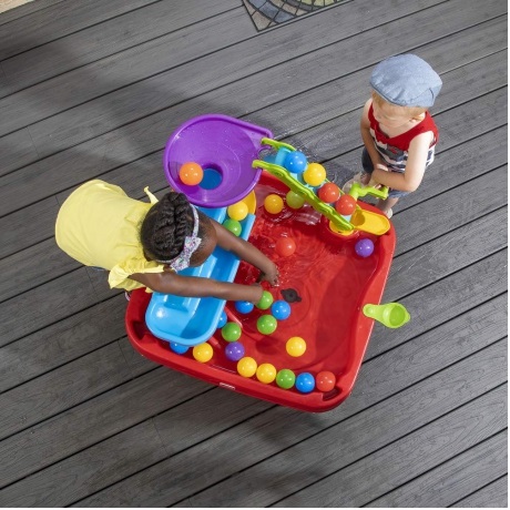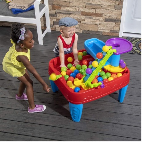 Stol je dovoljno velik da omogući djeci zajedničku igru, potičući razvoj društvenih vještina i dijeljenja. Dodajte vodu na stol kako biste povećali zabavu igranja loptom. Od poluga do katapulta i sustava kolotura , ovaj dječji stol s loptom ima sve. Spreman za igru? Postavite lopticu za igru ​​na podnožje tornja, a zatim zakrenite sustav remena i remenica da povučete loptice na najvišu razinu! Gledajte kako gravitacija vuče kuglice niz lijevak, kroz niz rampi, i konačno natrag u zdjelu stola. Dok se igraju, mališani uče o ranim konceptima fizike kao što su kretanje, sila, uzrok i posljedica i više!